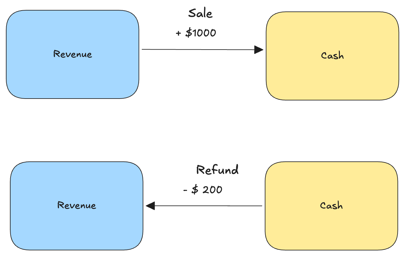 Consider an example: a refund to a customer. Imagine we are a software company and our application has gone offline for multiple days, so we issue a refund for part of our customer’s contract. How do we account for this situation? The naive solution would be to directly reduce the amount of revenue we’ve earned in tandem with the reduction in funds. A simple “insert” operation introduces a transaction which reduces the revenue account (and our bank account accordingly).